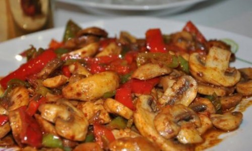 Tavuk-Mantar-soğan-domates-yeşil ve kırmızı biber-salça-baharatlar